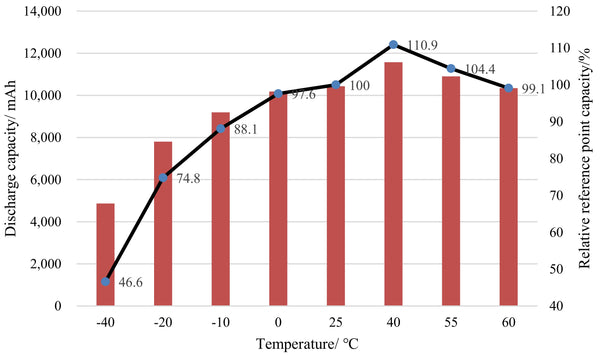 When the temperature is higher than 0 ◦C, the discharge capacity of the lithium ion battery basically remains above 93.4%. When the temperature is lower than 0 ◦C, the discharge capacity of the lithium ion battery begins to decrease, and it drops sharply as the temperature drops.